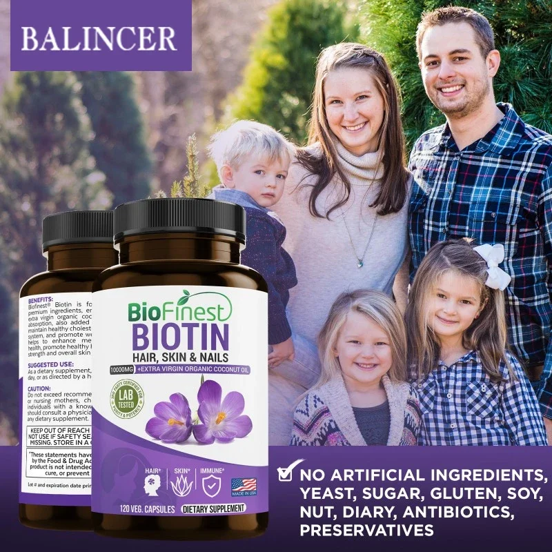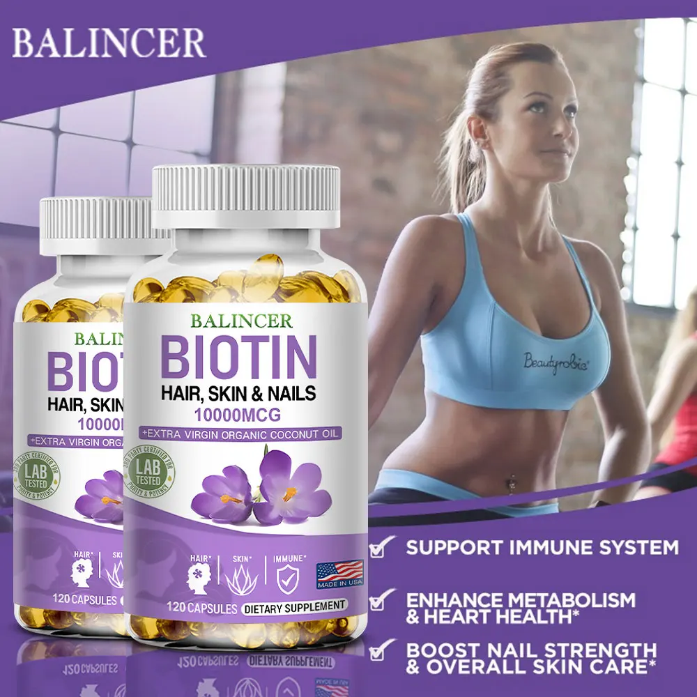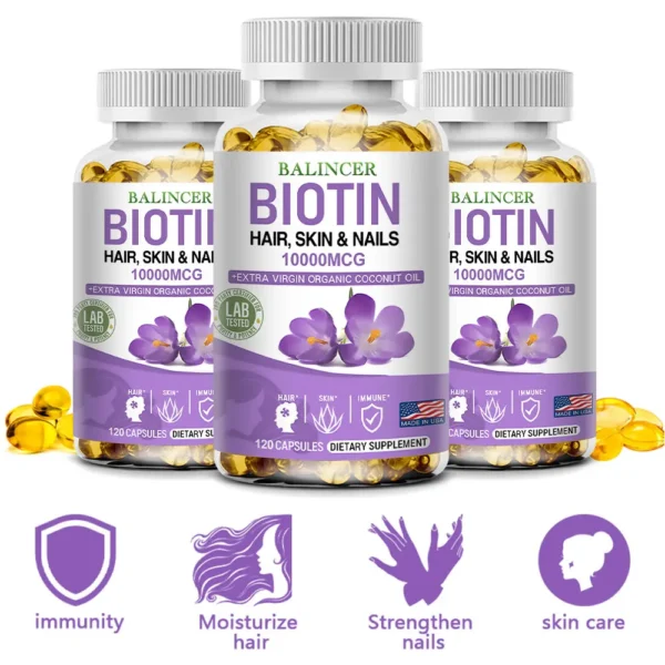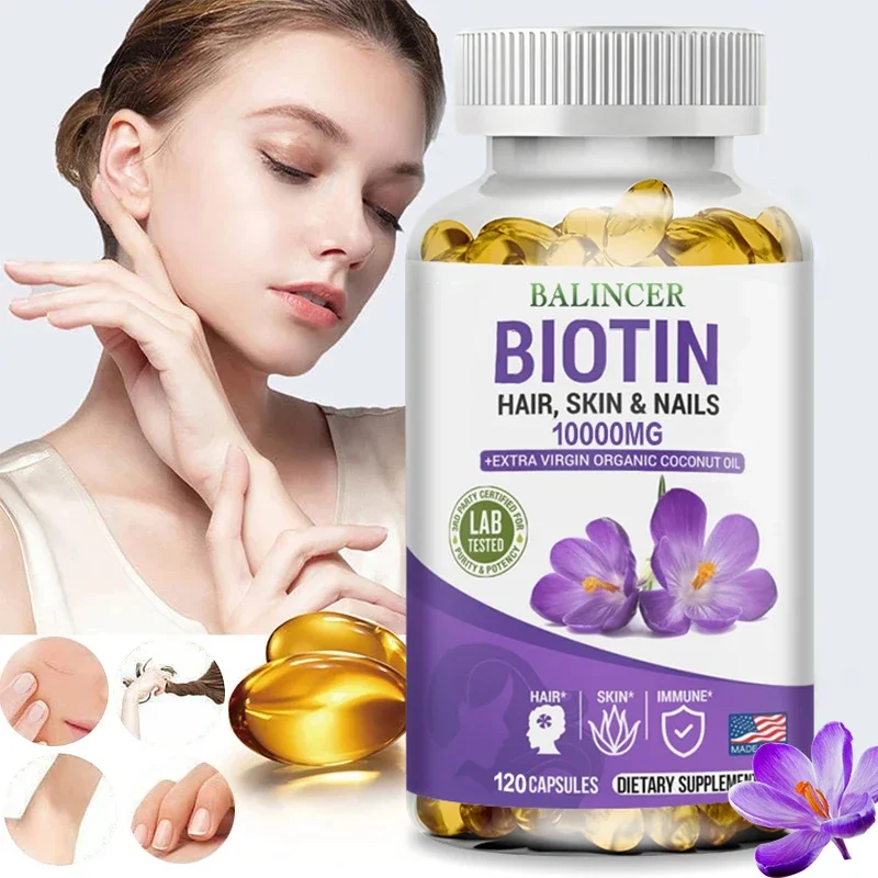 Balincer Biotin Supplement with Organic Coconut Oil – Supports Keratin for Healthier Hair & Skin, 10,000mcg, 30/60/120 Softgels