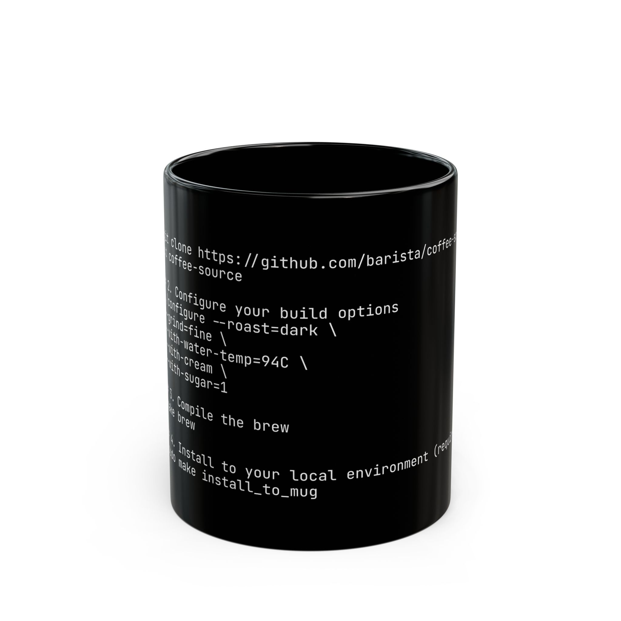 This black ceramic mug brings a quiet, code-side energy to morning rituals. The glossy black surface acts like a night-sky canvas for crisp, terminal-style white text — a subtle nod to coffee-loving developers who live in commits and configs. Hold it in the C-shaped handle, feel the heat through the smooth ceramic, and read the familiar lines that read like a build script fo