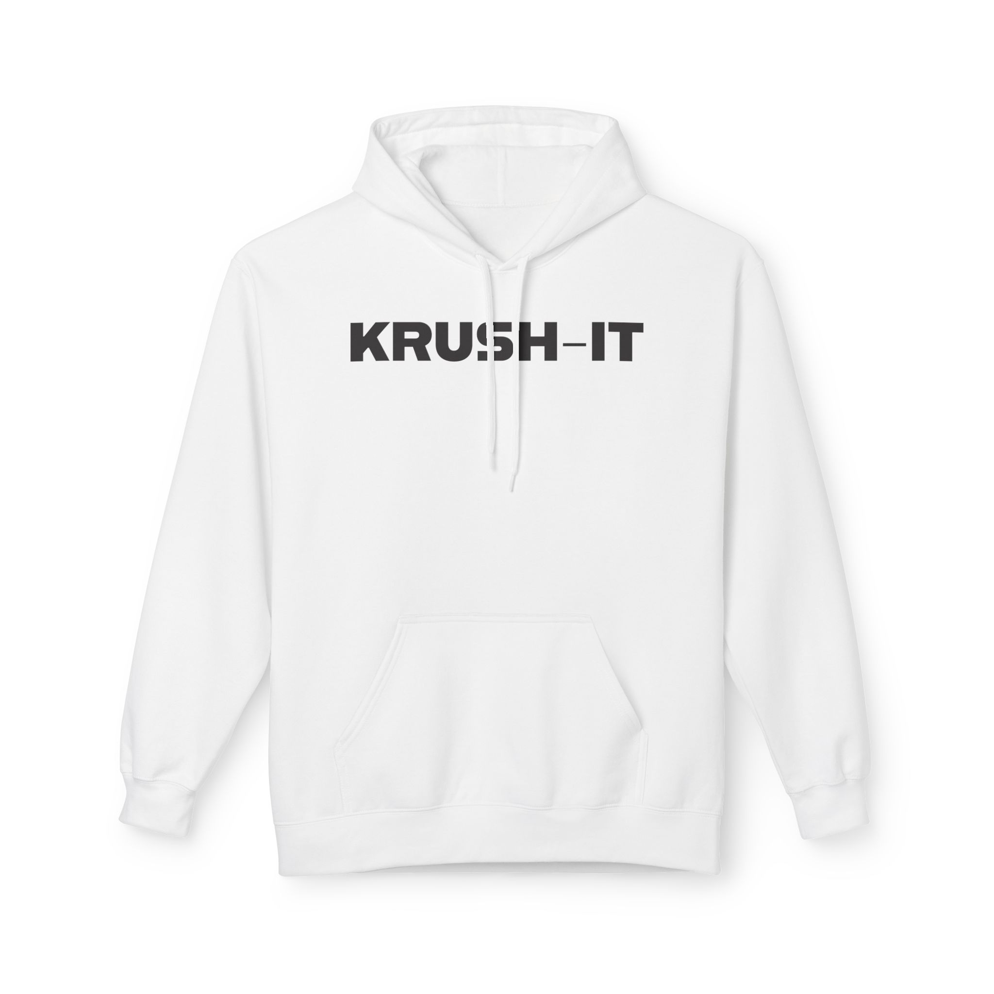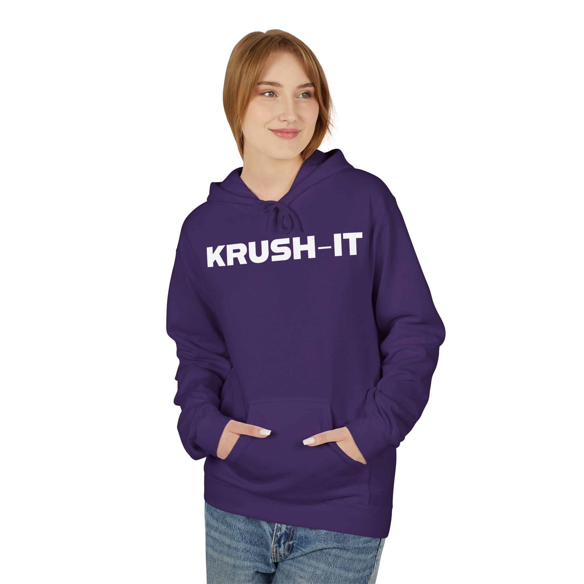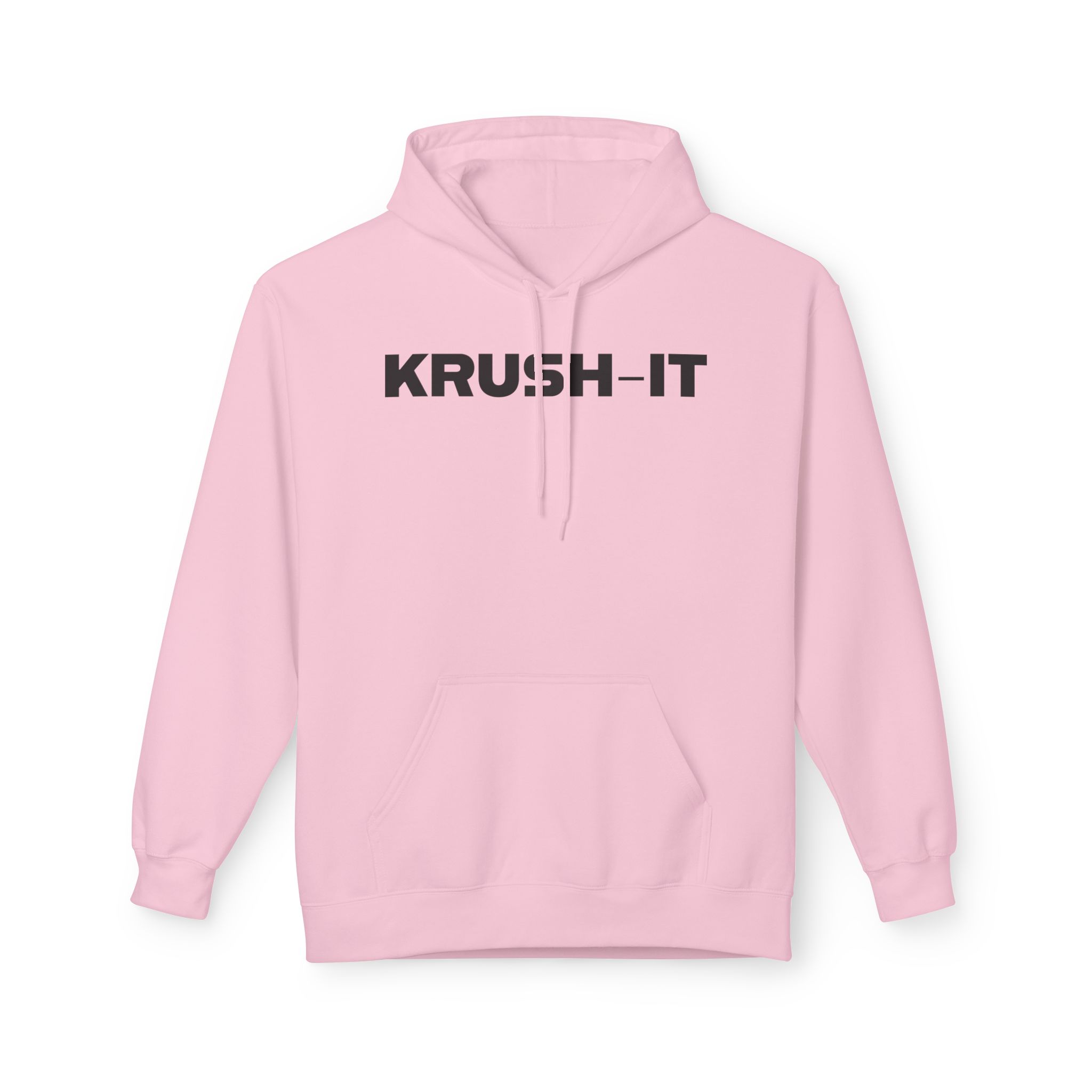 This midweight fleece hoodie speaks quiet confidence. Clean, minimalist lettering across the chest says ‘KRUSH-IT’ in a straightforward, bold type — a subtle nudge to move forward, take action, and keep momentum. The relaxed silhouette with dropped shoulders and a roomy pouch pocket makes it equally good for early-morning workouts, late-night study sessions, or slow coffee runs. The two-piece, color-matched jersey hood adds warmth without bulk. Made with a soft, substantial fabric that holds its shape, and produced under OEKO-TEX, FLA and WRAP standards, it’s a responsible wardrobe piece that blends comfort, durability, and understated motivation.